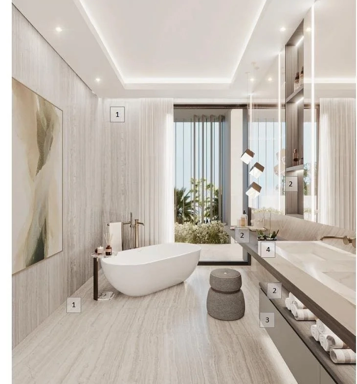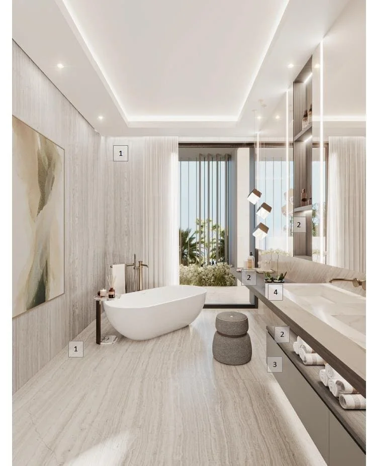 Bathroom: Porcelain tiled floors and walls -all bathrooms. Sanitary ware and fittings. Vanity with under tier cabinet and stone countertop. Glass enclosures – Shower / WC. Mirror –All bathrooms